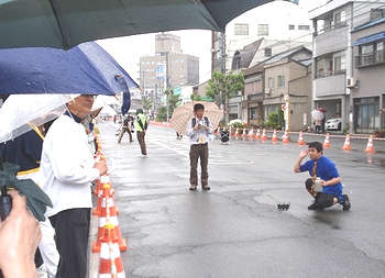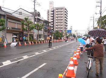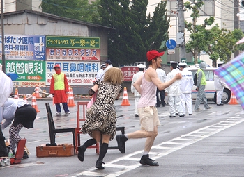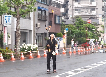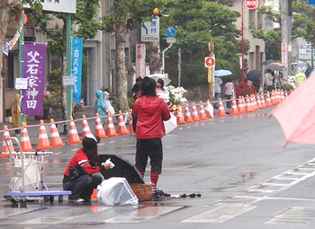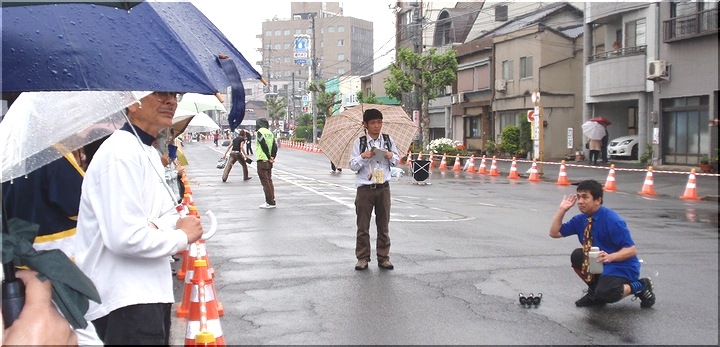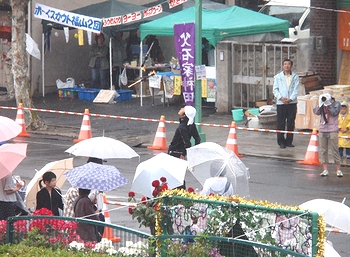バラ公園内の展望台からパレードコースに眼を向けますと、降雨の中を何名かの若者が大道芸の真っ最中(^.-)☆