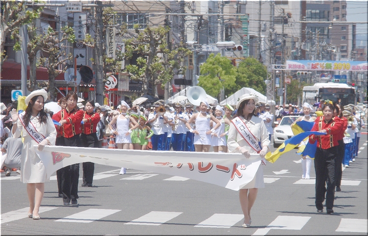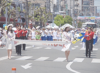 昨年度の“ミスばら”のお二人が手にされました横断幕を先頭に、いよいよパレードの開始となりました。