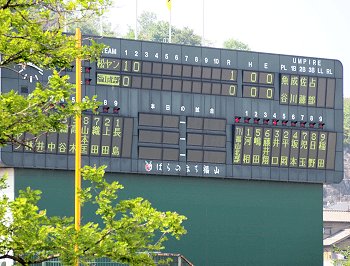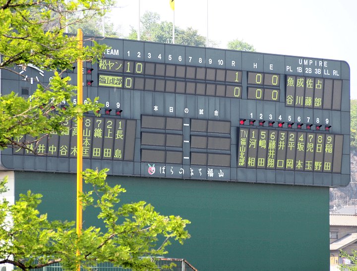 ゴンchanと通りがかりにスコアボードに眼を向けますと、「松永ヤンキース×福山北部野球団」の熱戦中でありました。
