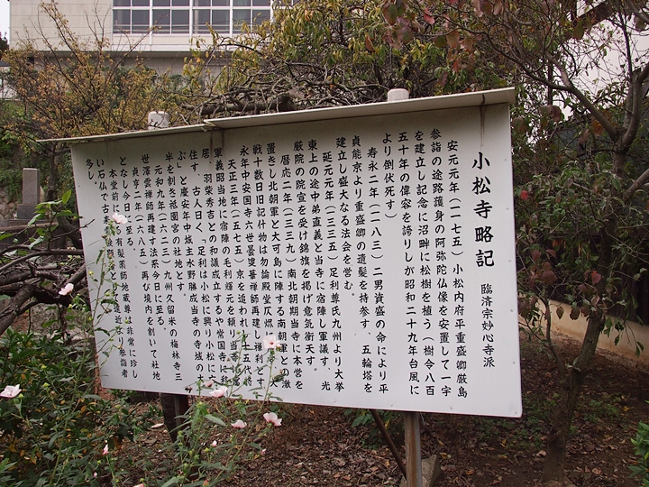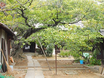 かつて法宣寺には国の天然記念物がありました。大覚大僧正お手植えと伝わる黒松の巨木です。その枝ぶりから「天蓋マツ」とも呼ばれ、鞆の浦の人々の誇りでしたが、残念ながら、1991年夏、六百余歳で枯死しました。支柱と切株だけが残った跡地は、無常の想いを呼び起こします。ただ不思議なのは、老松が枯れて以来、今まで影が薄かった隣の紅梅が生気を得て、最近では新しい花の名所になっていることです。往く者あらば来る者あり。春の境内でそんな感慨にひたるのも「あり」かもしれません。