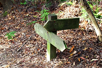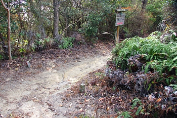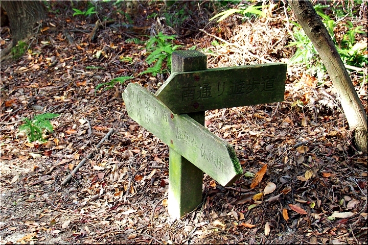 慎重な足取りで下っておりましたら、ヤッと尾根歩き遊歩道≠ェ下の方に見えて来ました。案内標識も(^.-)☆