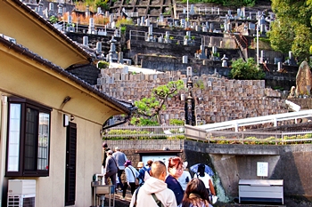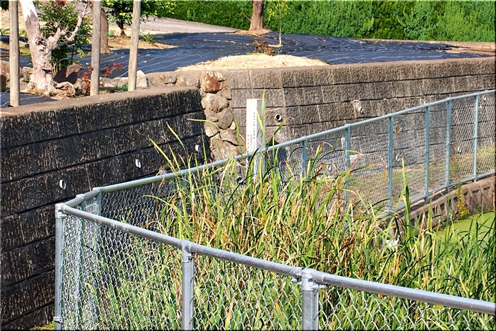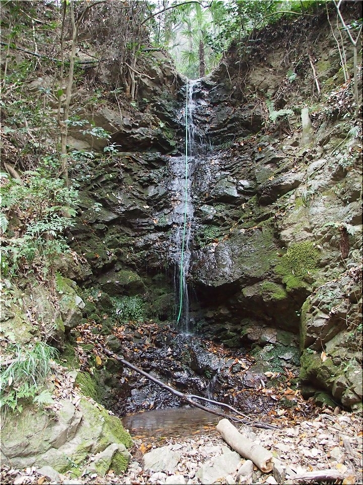 妙顕寺境内北端側から墓地に上がり、墓地脇の小道を北側に進み、樹木の間を抜け砂防ダム下にと到着です。