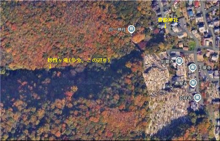 挿入の妙性ヶ滝≠フ画像は、7〜8年前になりますでしょうか…墓参りで訪れました便を利用し、独りで妙性滝を訪れまして撮りましたものです。夏の渇水期に訪れましたからこんな滝壺ですけど、水量の多い時期に訪れますと滝らしく見えたものと思います。