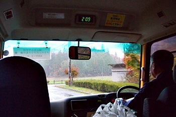 外に出ましてバスに乗り込もうとしますと、相変わらず降雨は続いておりました。多少、雨足も強まっていますような…全員乗車を終えますと、バスは一路、水呑へと(^-^)