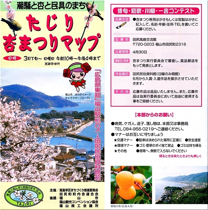 大正元年(1912)広島県農試のまとめた『芸備の園芸』には、こう紹介されている。「沼隈郡田尻村には、戸毎其宅地内及空地に数本の杏を有せざるなく、年々其産する果実を売却して、宅地租及諸雑費を補ひて尚余りあり。花時(四月上旬神武天皇祭の頃を盛とす)同村を過ぐれば恰も白雲靉靆として模糊の裡にあるが如し」と。