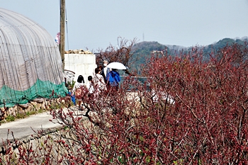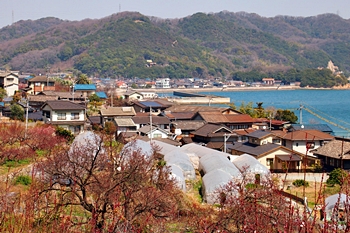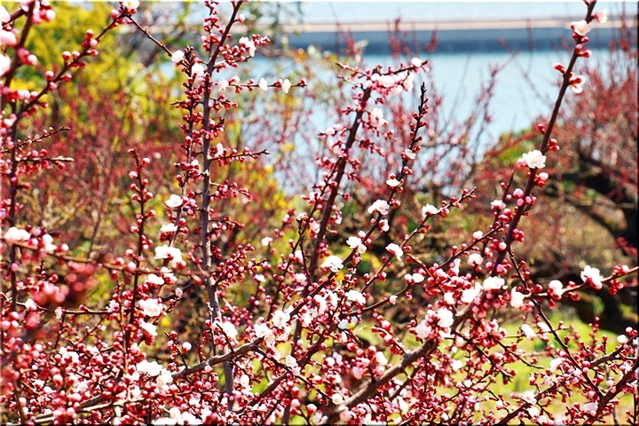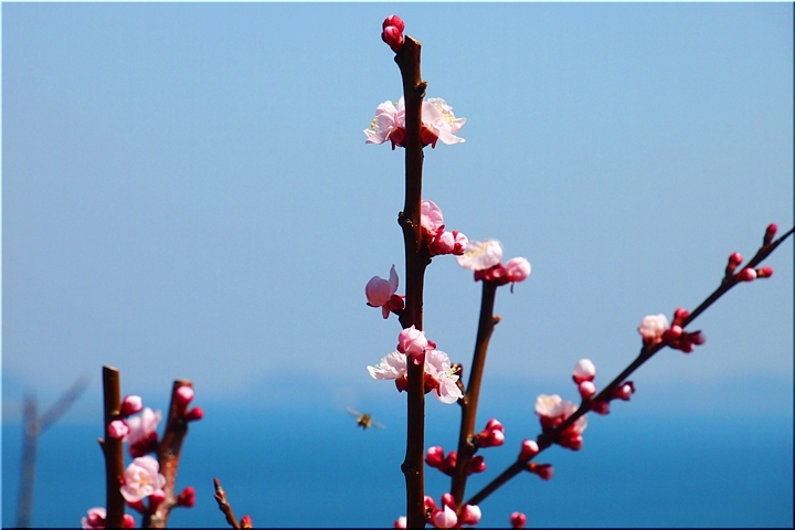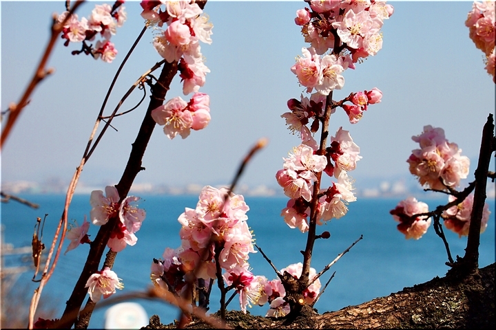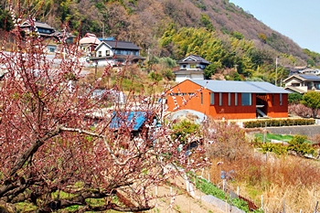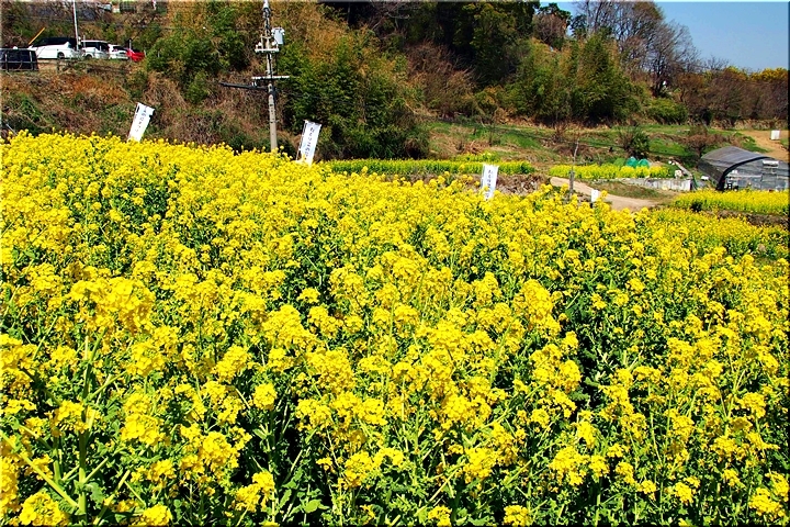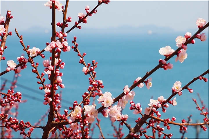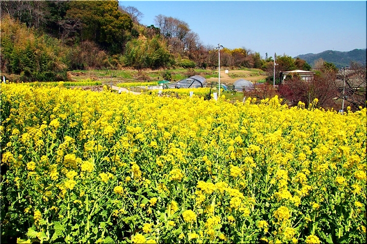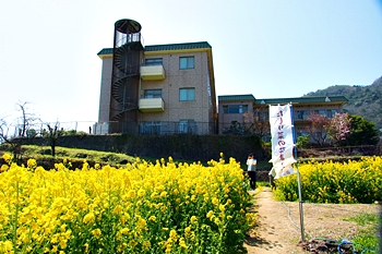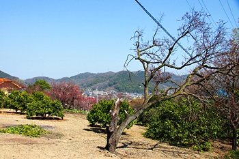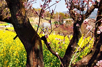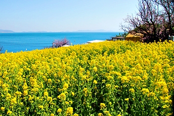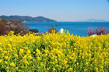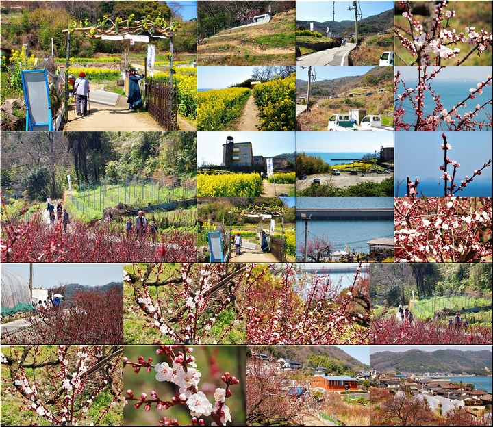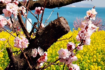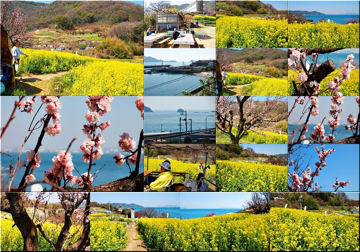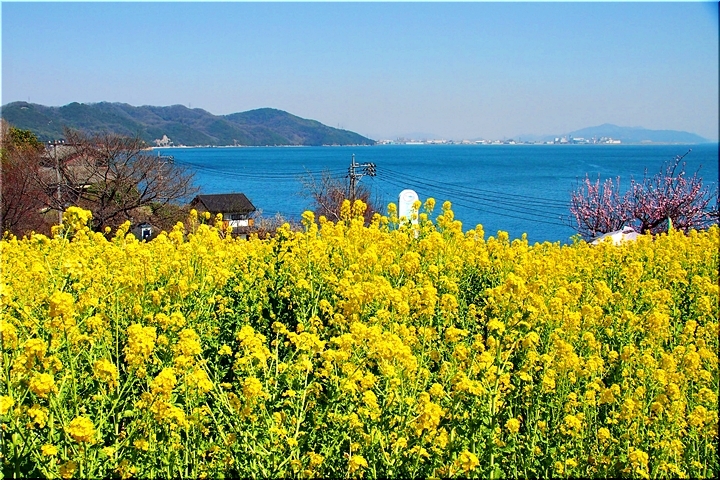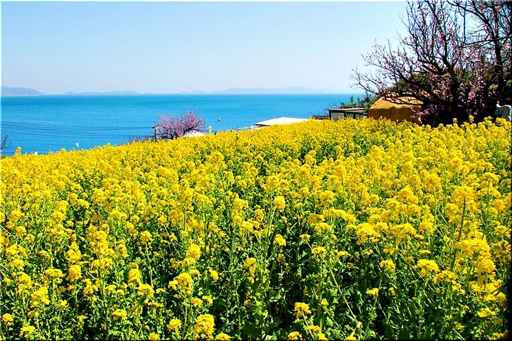 ブルーの瀬戸内を背景に、一面黄色の菜の花畑。そんな中にピンクの杏が点在…と、色彩的には仲々イィ景観であります(^-^)//"