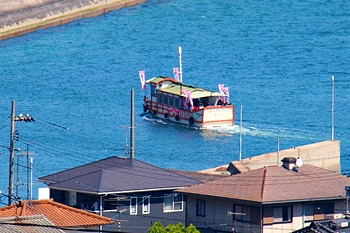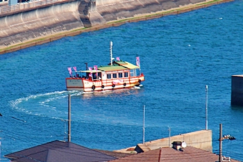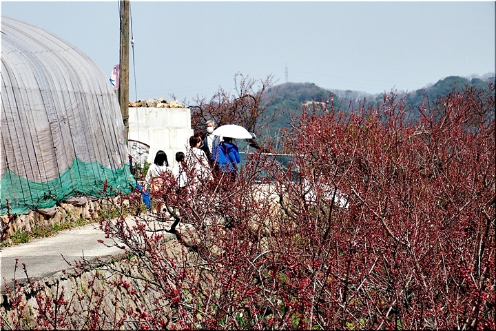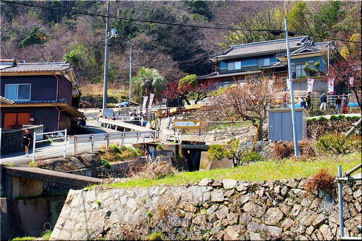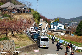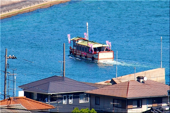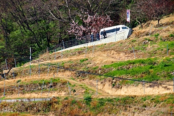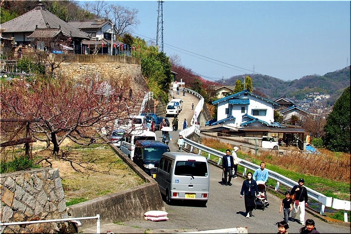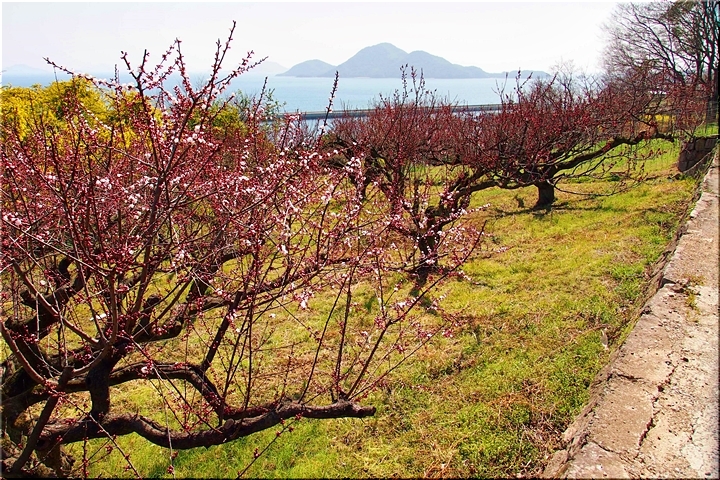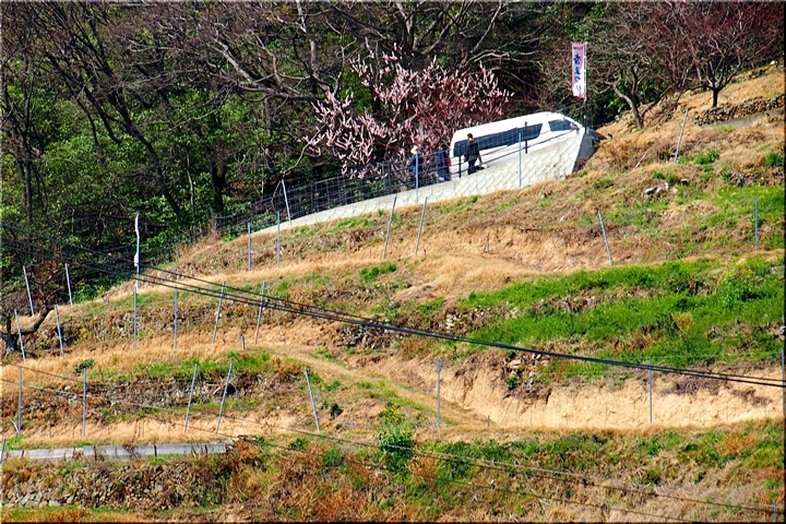 春の匂いを嗅ぎながらノンビリと歩いて来ましたけど、杏園品種比較試験地≠ヨと戻って来ましたネ。瀬戸内に眼を向けますと、丁度、杏船≠ェ出航中。うん、うん、今年は別段トラブルも無く、順調に来訪客をエクセル下まで搬送していますようですネ(^.-)☆