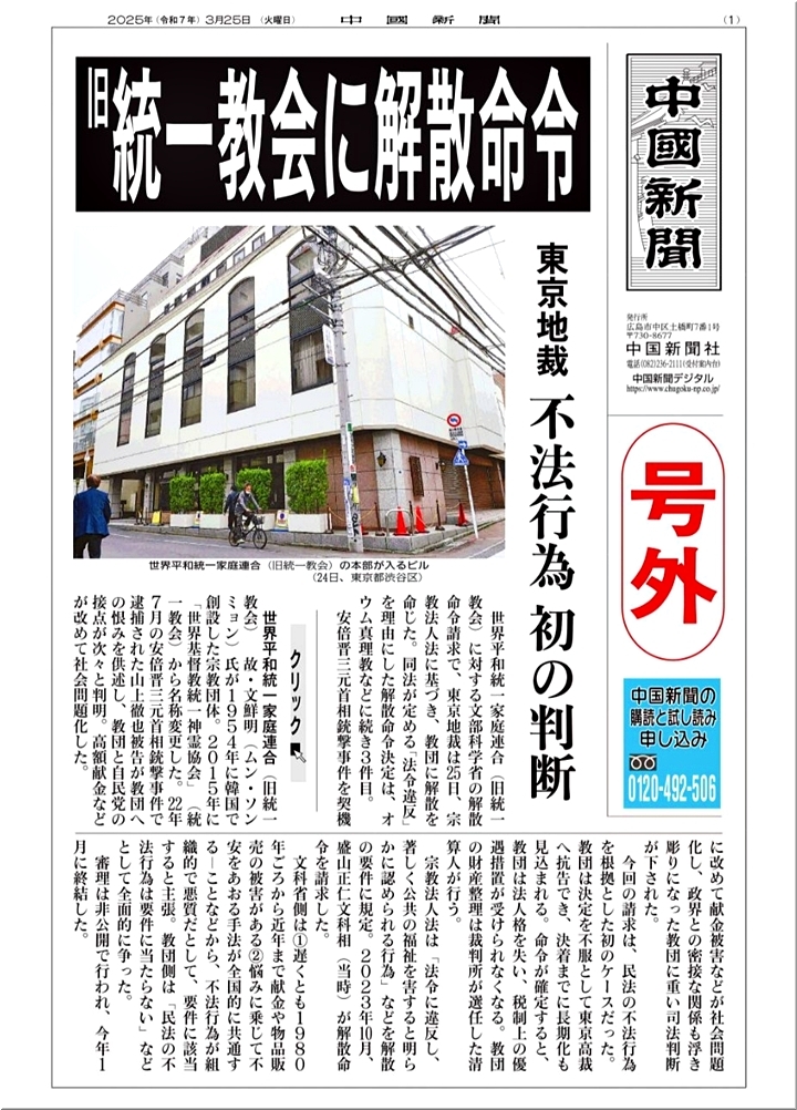 3/25(火)に中国新聞sanの号外が発行されておりましたけど、世界平和統一家庭連合(旧統一教会)を巡る解散命令請求について、東京地裁は25日、文部科学省の主張を認め、解散を命じる決定をしましたようですネ。