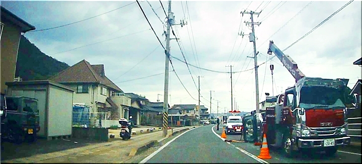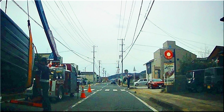 コンビニでタバコを求めての帰路では、丁度、クレーン車が軽四車を吊り上げ作業中でありました。