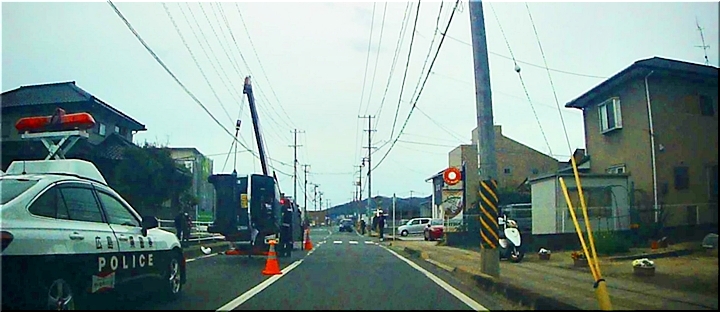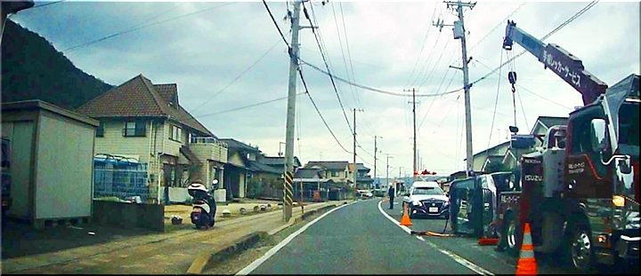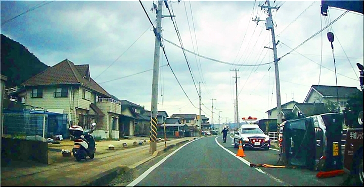 現場は、信号の有りません交差路の少し手前ですけど、どんな状況下で横転しましたのでしょうねぇ〜それに、パトカーの急行音は聞こえましたけど、救急車のサイレン音は聞こえて来なかったような…