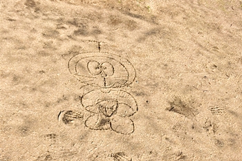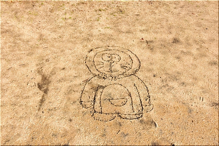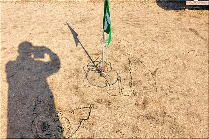 いつものように、今朝は6番ホールのホールポストを手に所定の位置に設置しようとして、眼が止まりましたのが、地面に描かれたこのイラスト(^.-)☆