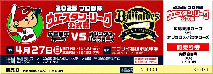 ふ〜ん、4/27(日)は、ウエスタンリーグカープ×オリックス$の開催ですか…