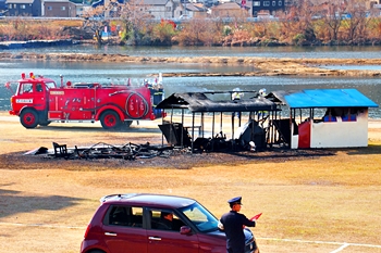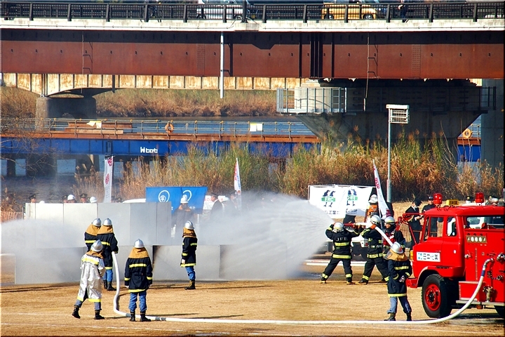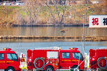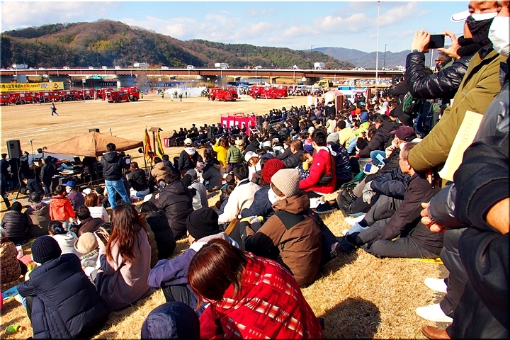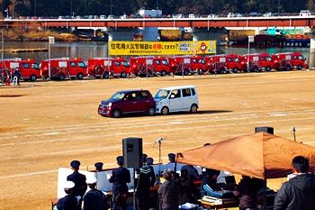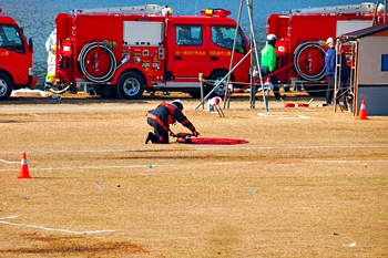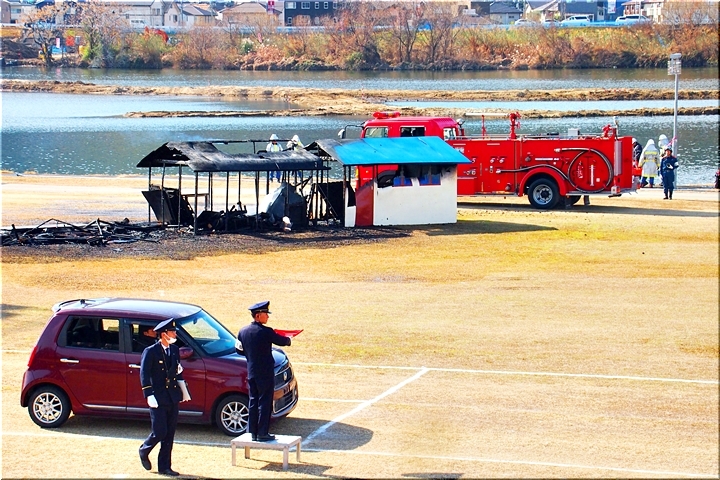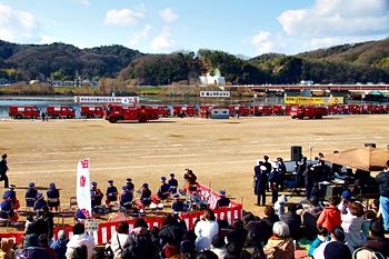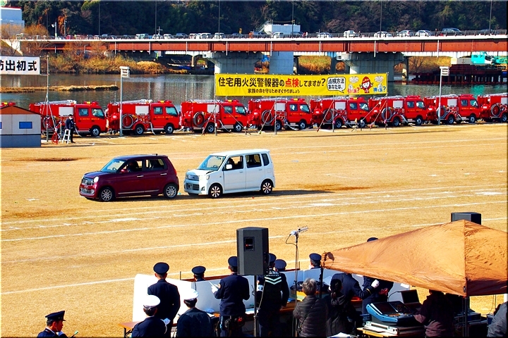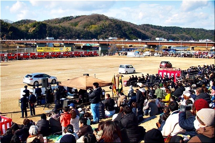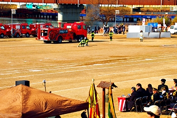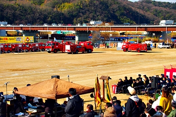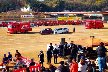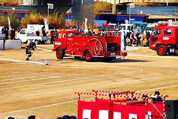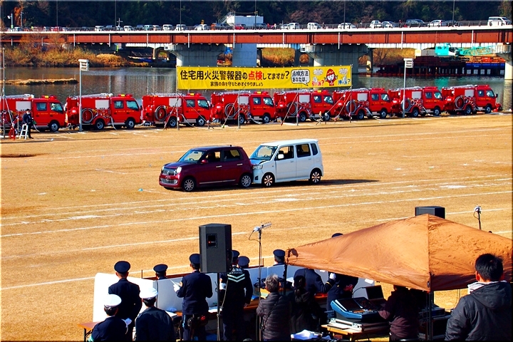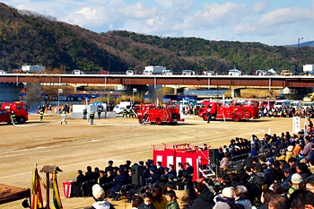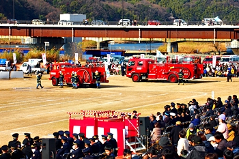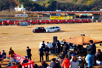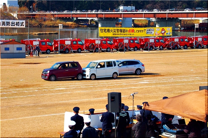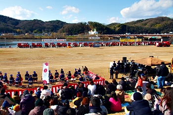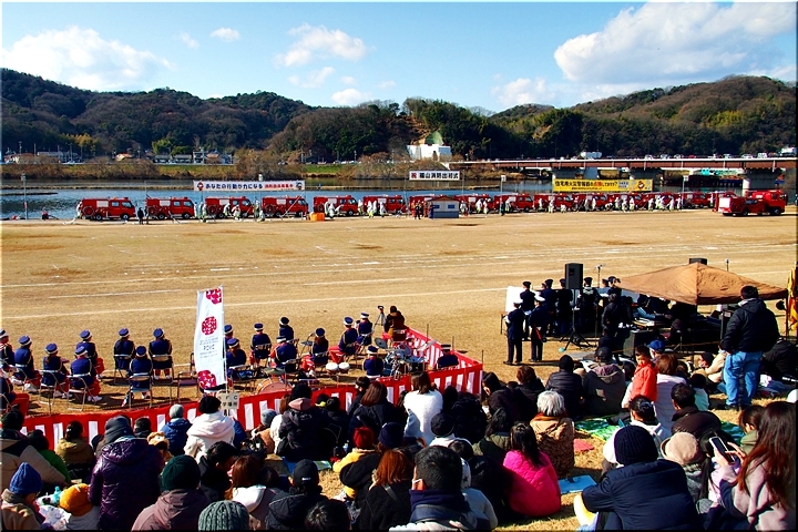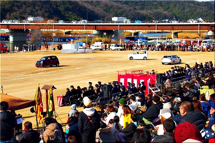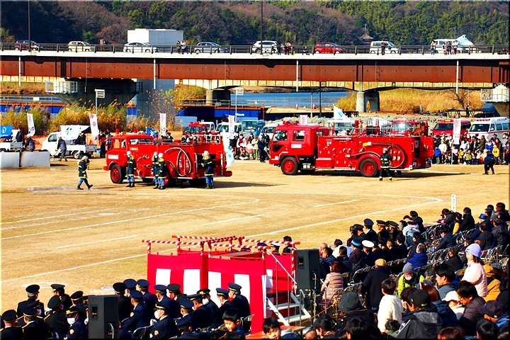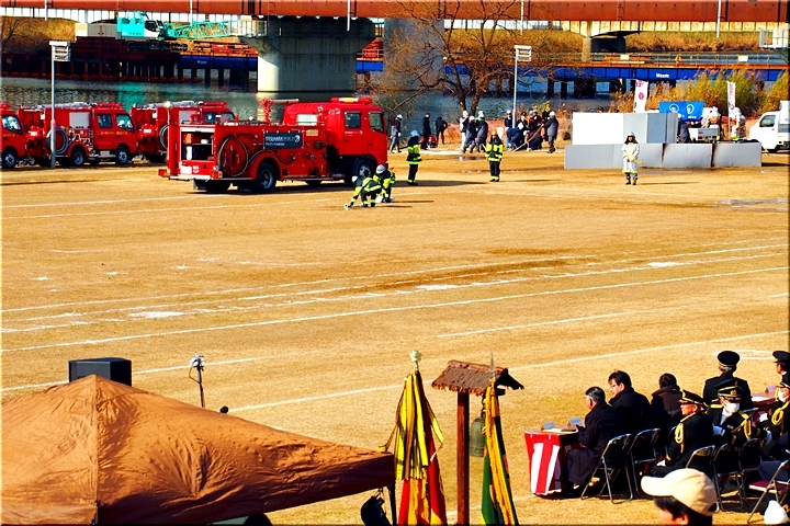 この間には、各分団の消防車が護岸近くに整列です。未だ未だ公開訓練は続いて行きますけど、出初式の最後を一斉放水≠ナ飾りますから、今のうちに待機と言ったところでしょうか…