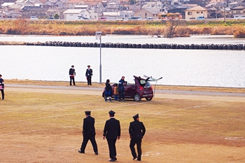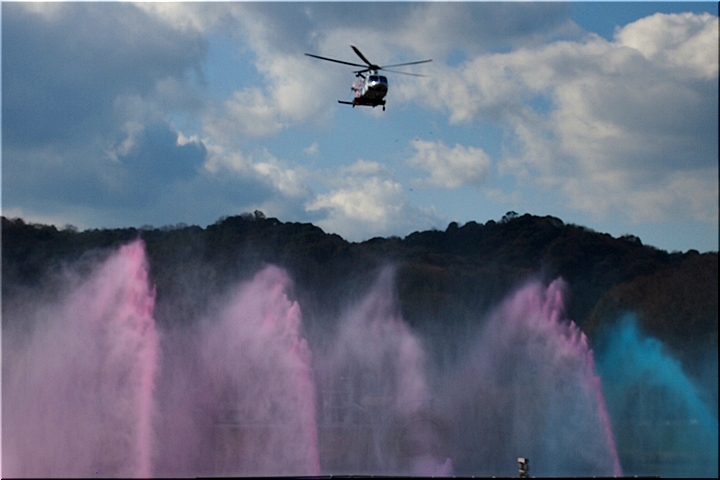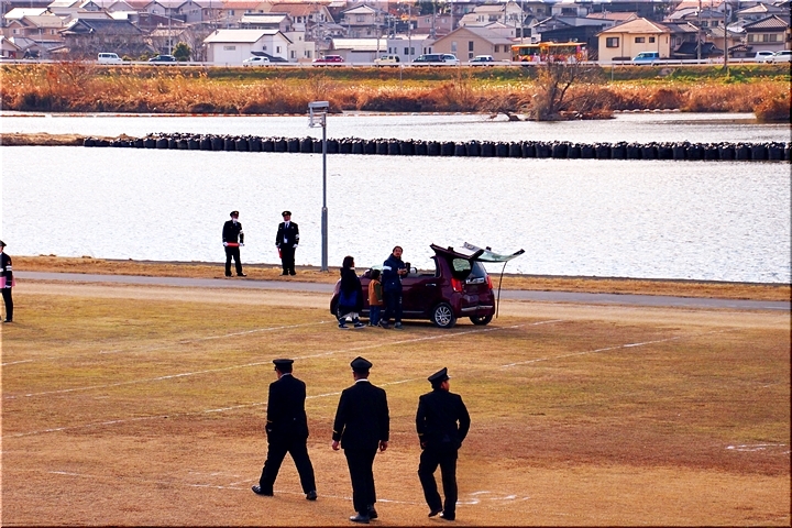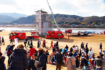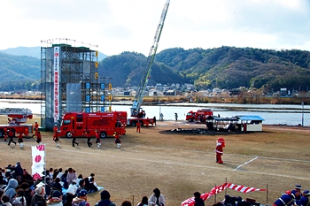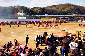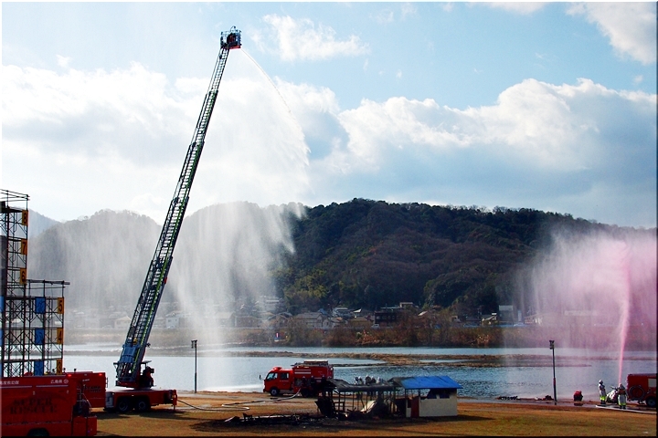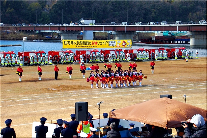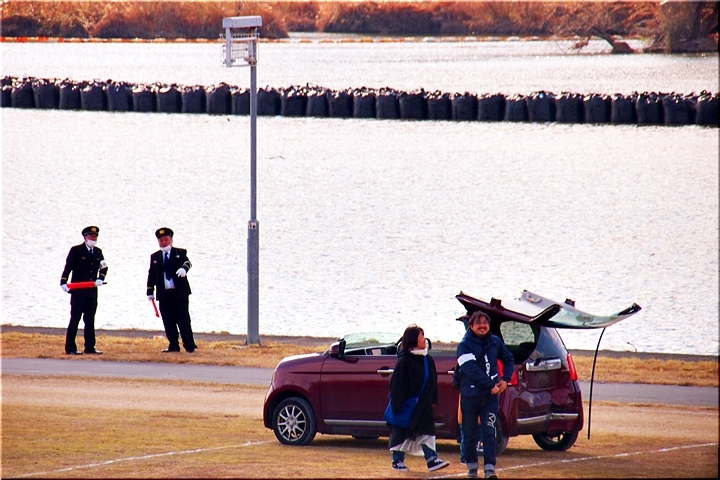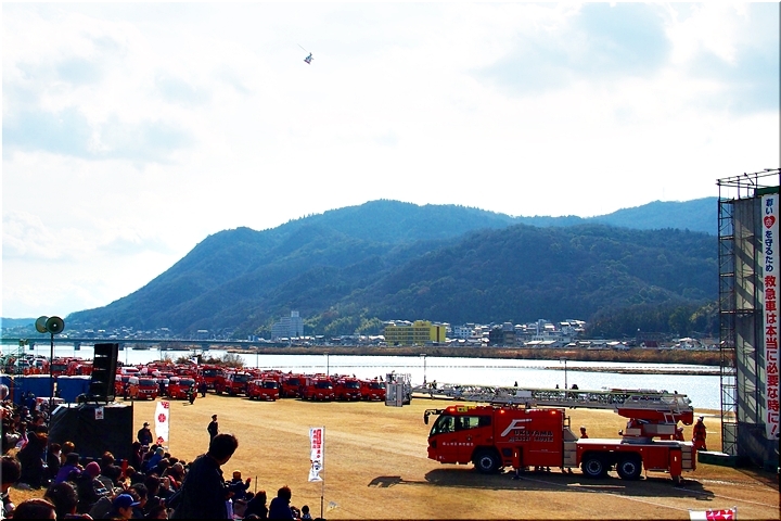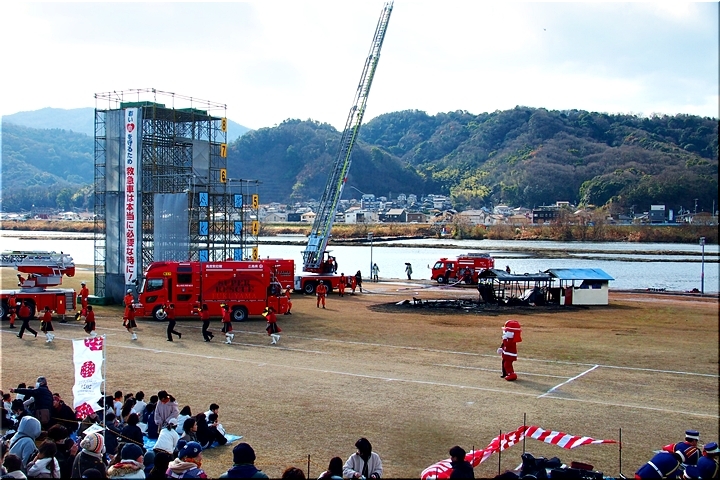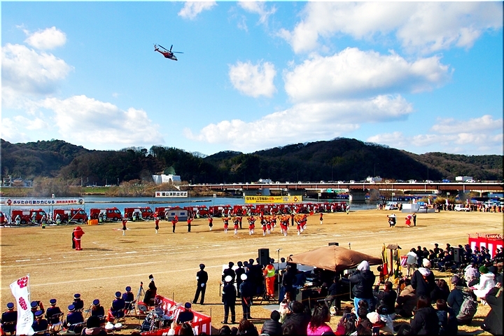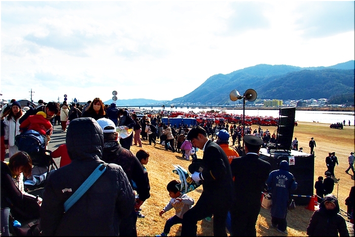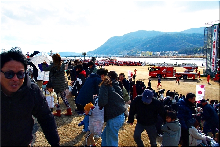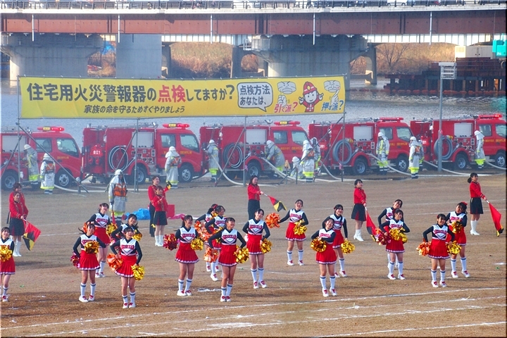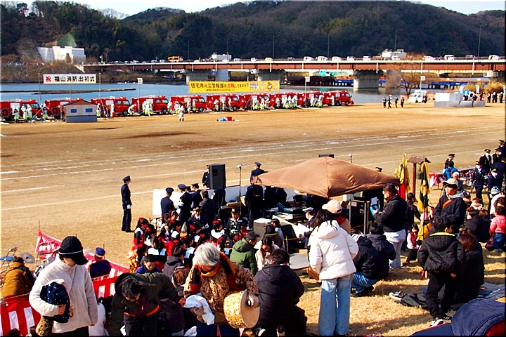 昨年も、一昨年も、こぅして出初め式が行われています最中には、対岸の土手をサイレン音と共に現場に急行します救急車が1台眼に入りましたけど、今年はありませんでした。出初め式に合わせ、わざと走らせているのかと思っていましたけど、う〜ん、そぅでは無かったようですネ。タマタマでしたのですねぇ(^-^)//"