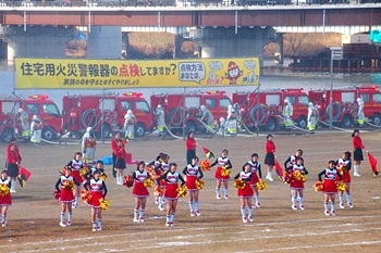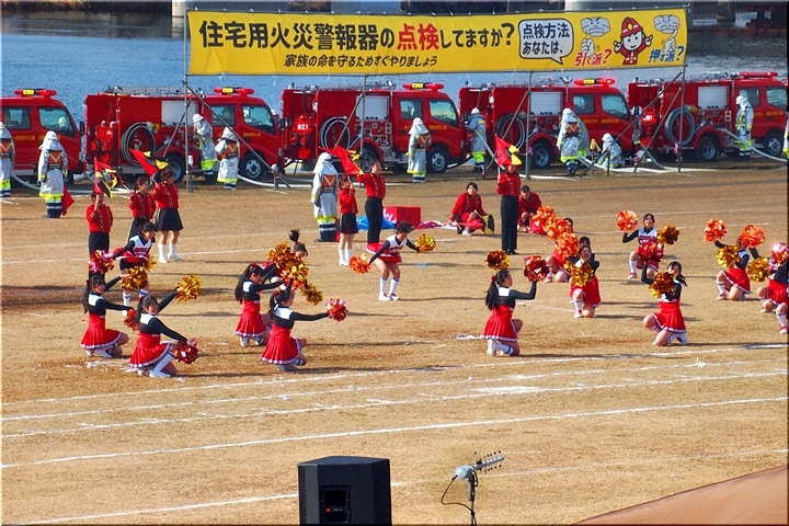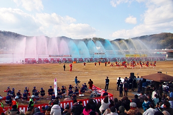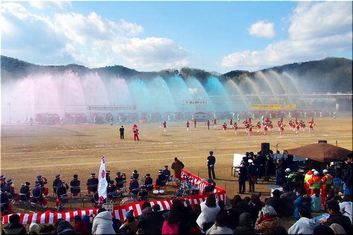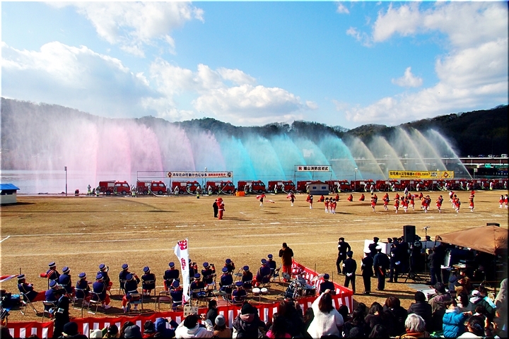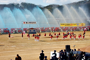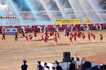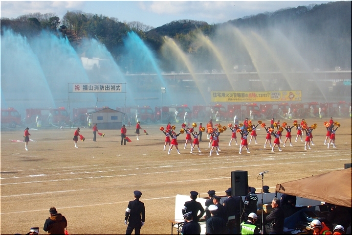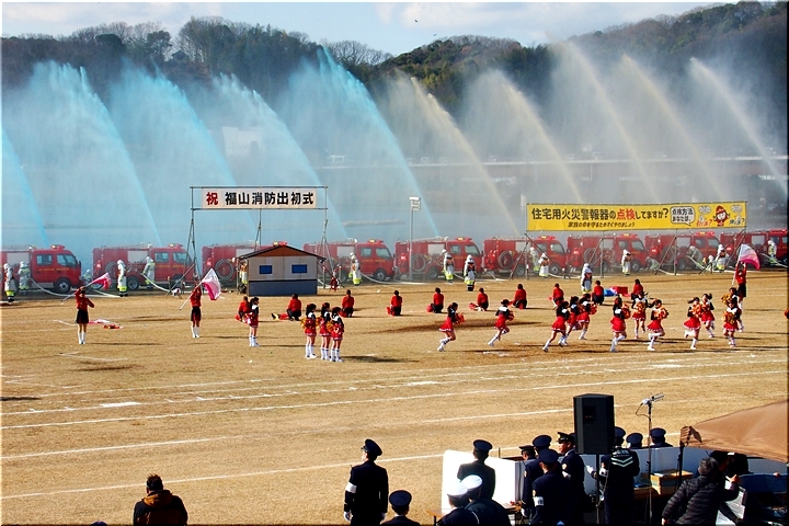 誠之館高校チアリーディング部の演技、そして、一斉放水を終えますと、2025年福山消防出初式プログラム≠ヘ凡て終了です。