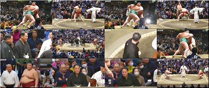 今場所での綱とり絶望となった大関琴桜は熱海富士と対戦したが、決着前に審判が手を挙げてしまい、やり直しとなるハプニングがあった。やり直しの一番は熱海富士が制した。