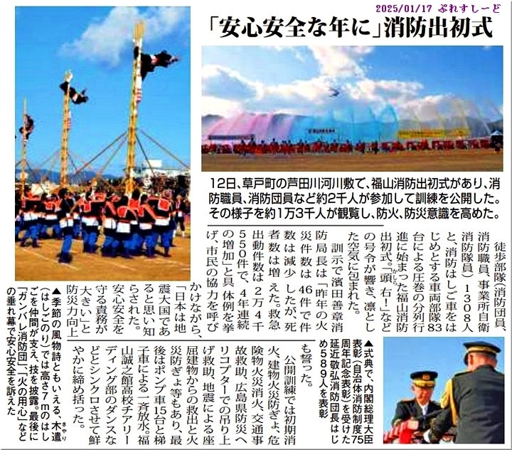 これは、いずれも、1/17(金)発行の中国新聞=芙ぷれすしーど≠フ掲載記事なんですけど、まずは、タウン誌ぷれすしーど≠フ「福山消防出初め式」の記事。