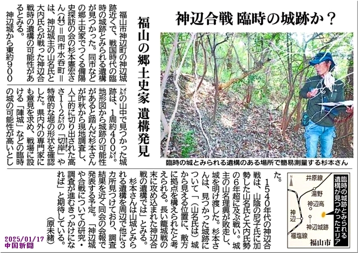中国新聞sanの記事は、備陽史探訪の会≠フ「杉本憲宏」sanが現地調査を続けておられます「神辺合戦時の臨時の城跡の遺構=vを取り上げておられます。