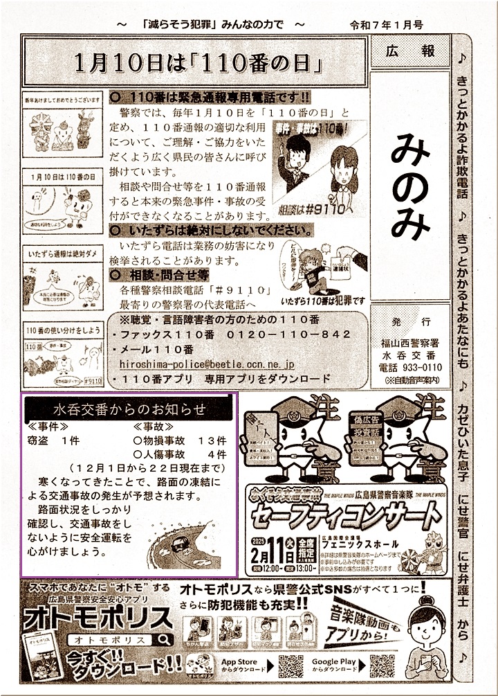 自治会回覧で、福山西署・水呑交番の広報が廻っておりましたので、12月中の事件発生を見てみますと、水呑交番管内での事件・死後発生は、