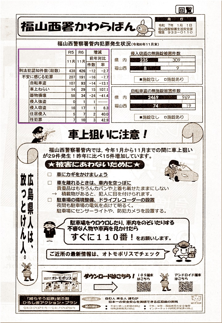 福山西署管内の犯罪発生状況を見てみますと、刑法犯認知件数は、総数の前年対比では、▲2.7%と減少にありますけど、唯一増加が顕著な項目を挙げますと車上ねらい≠フようであります。