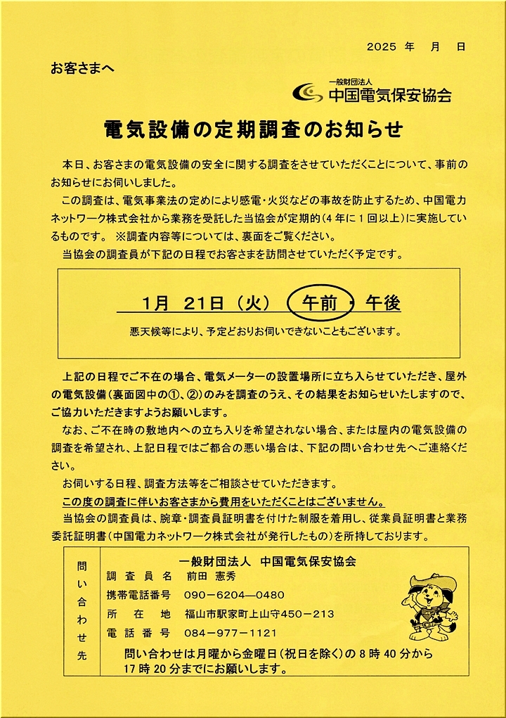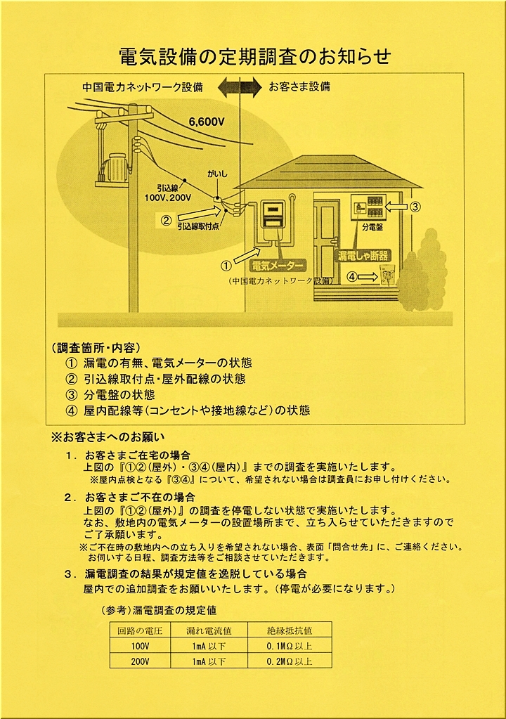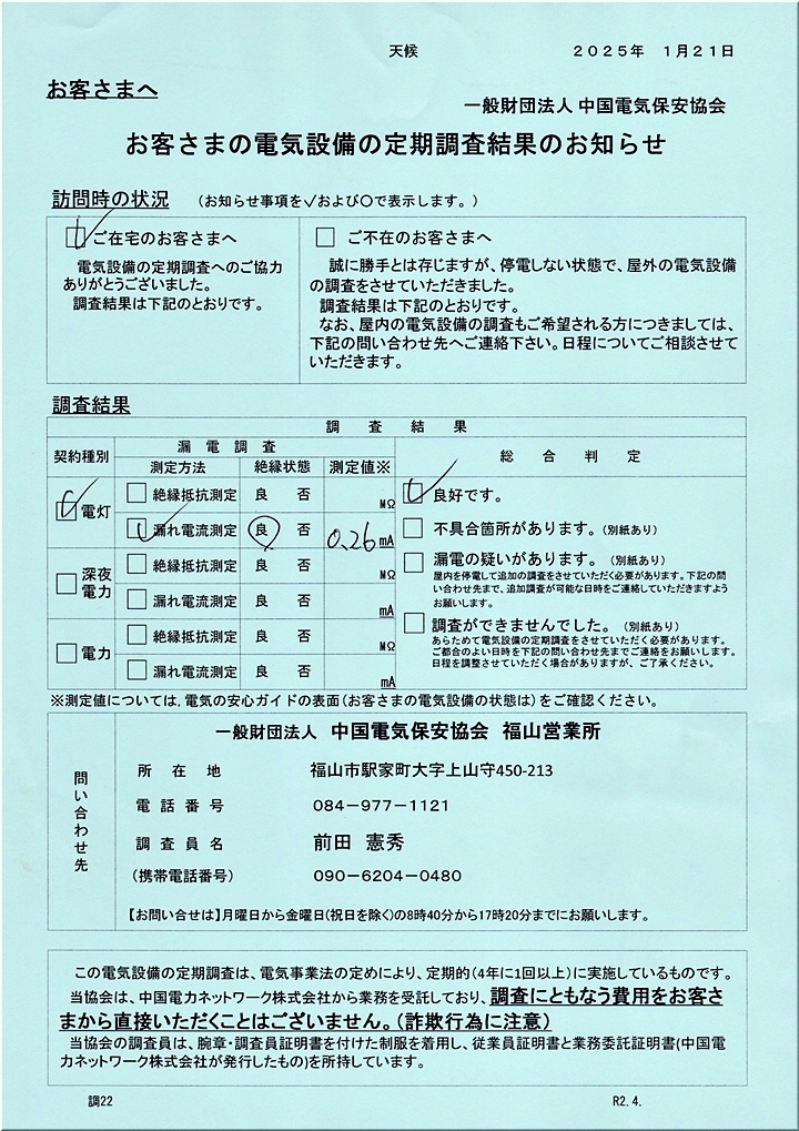1時間ばかり後で郵便受けを覗きますと、こんな「お客様の電気設備の定期調査結果のお知らせ」が投入されておりました。