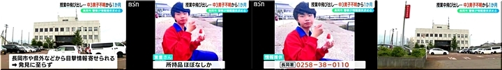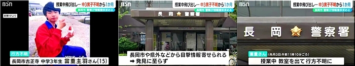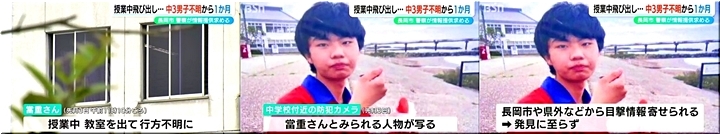 ◆「授業中に教室を出たまま行方不明」新潟県長岡市の中3男子 1か月以上経っても見つからず