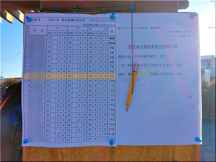 掲示板に眼を向けますと、先日・1/8(水)の打ち始め日新年親善GG大会≠フ成績表の掲示が…