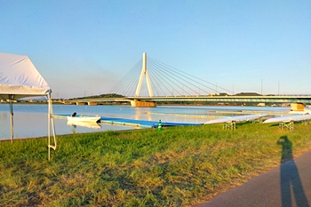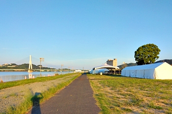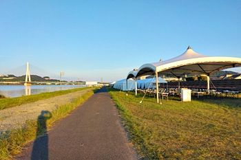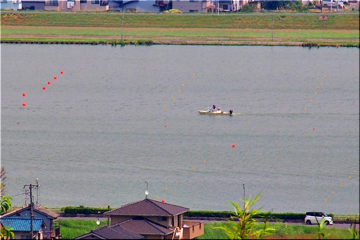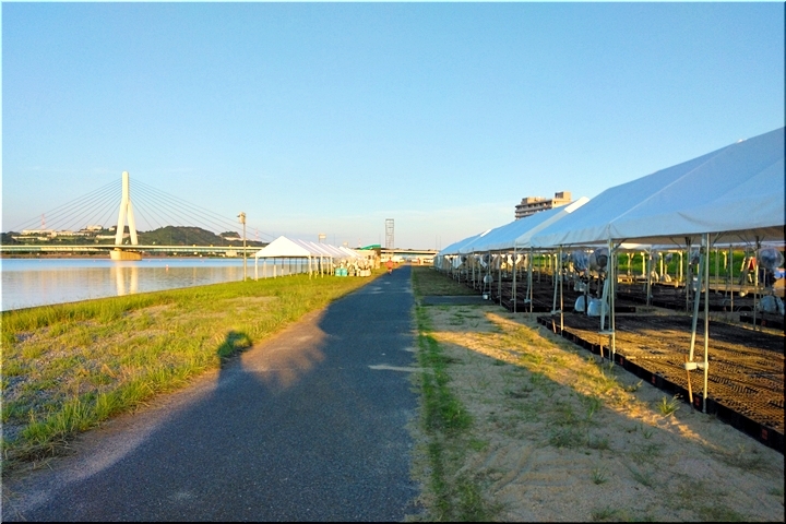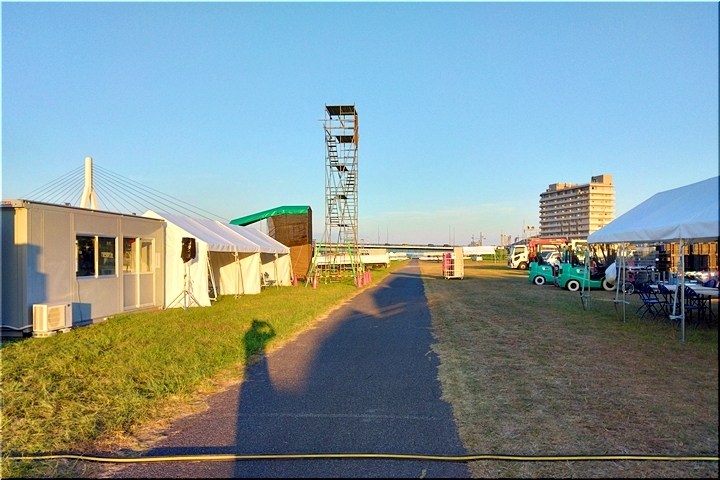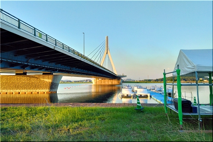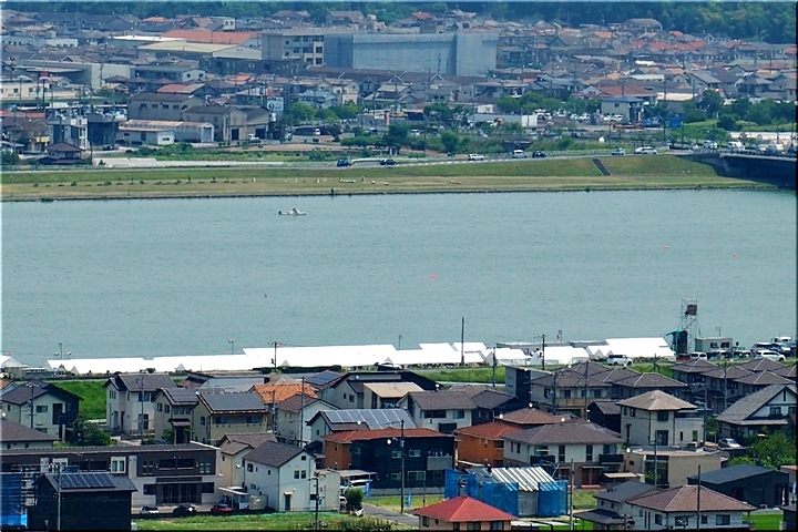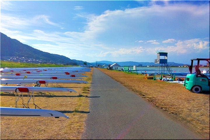 芦田川大橋から少し上流辺りでは、8/1(土)〜8/3(月)間のローイング競技実施に向け着々と準備が進行していますようであります。