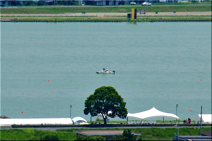 インターハイ2025≠フローイング会場であります芦田川漕艇場≠ヘ、この日は公式練習(2日目)と開会式・代表者会議との事で、いよいよ明日から競技スタートです。が、もぅ正午前ですから、コース上には艇も選手の姿もありません。昼食タイムに入っていますのかも…