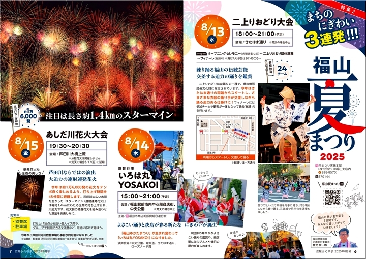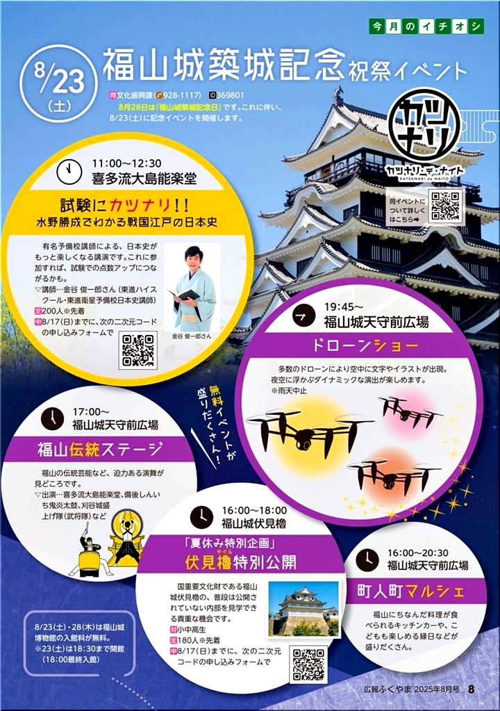 夏まつり≠ニ言いますと、先日、新聞折り込みの中に、市の広報も入っておりましたけど、8/13〜8/15の3日間は「福山夏まつり2025」の開催ですネ。そして、8/23(土)は「福山城築城記念祝祭イベント」の開催。