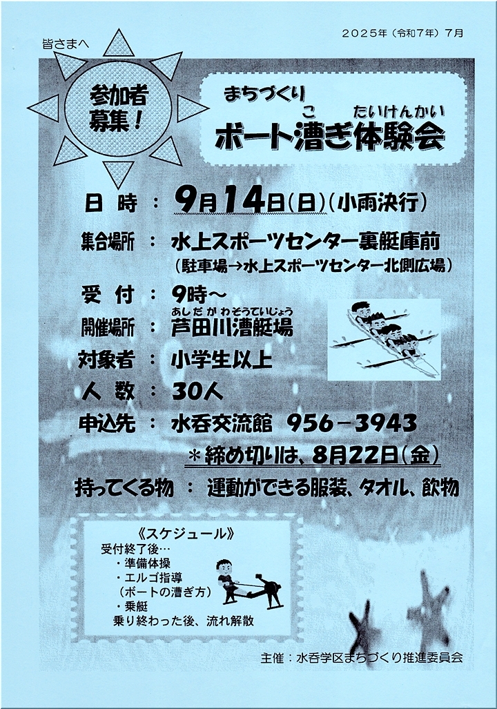 それと、「ボート漕ぎ体験会」のご案内程度。ボート漕ぎ≠ニ言いますと、本日まで芦田川漕艇場では「インターハイ2025」のローイング競技≠ェ開催されていますから、小・中学生の皆様の関心が高まりまして参加者増となりますかどぅか…