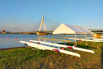 本日は公式練習(2日目)と開会式・代表者会議が行われました。気温上昇とともに風も少し強まる中での水上練習となりました。選手たちは日傘やアイシングスポットを利用しながらリギングをしていました。
