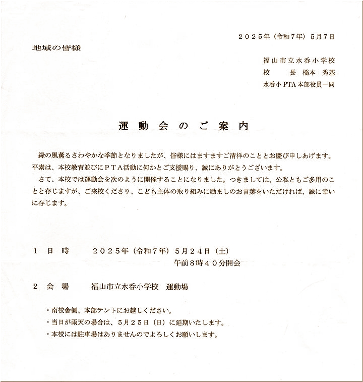昨日・5/24(土)開催予定でした水呑小学校の運動会…雨天順延で、本日・日曜日の開催となりました。