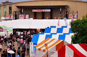 公園東側の芝生広場に向かいますと、ステージ上では、賑やかに歌と演奏が(^.-)☆