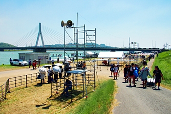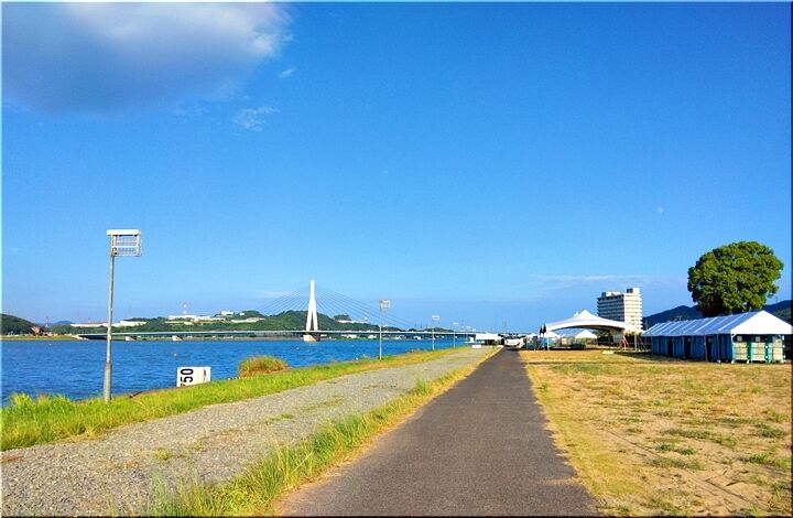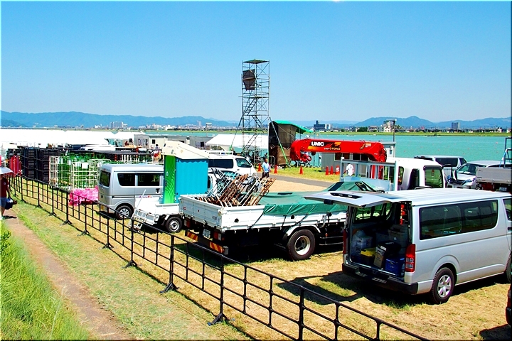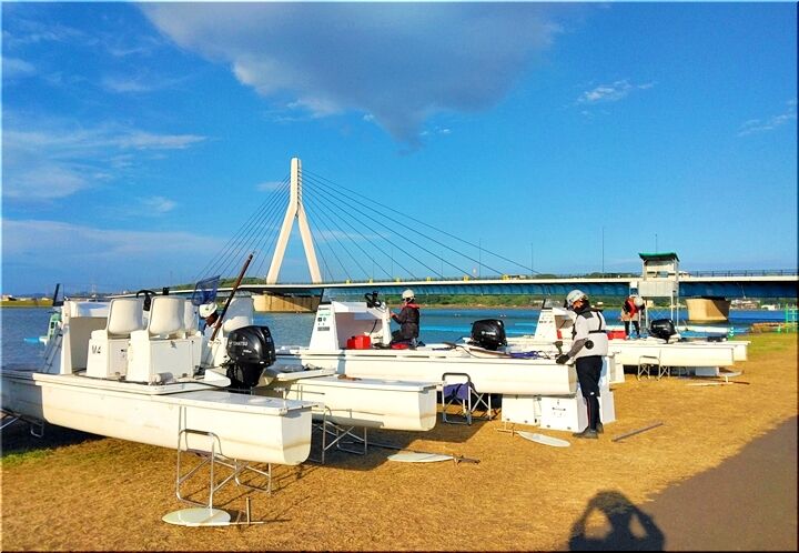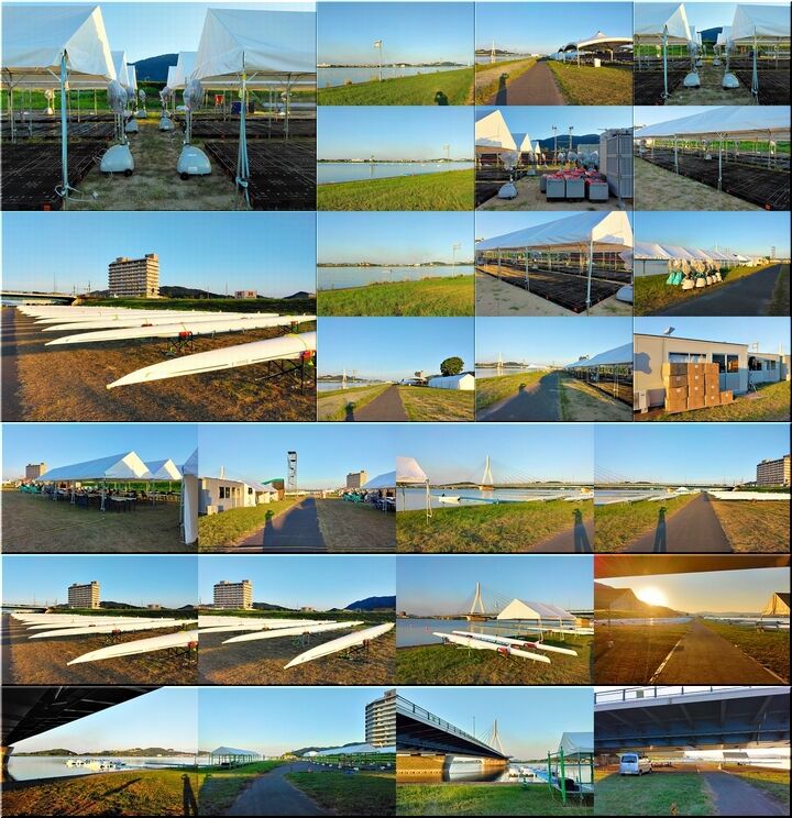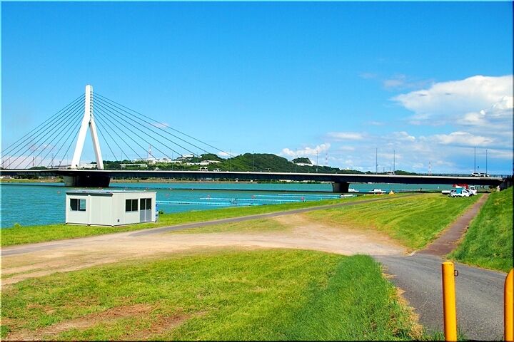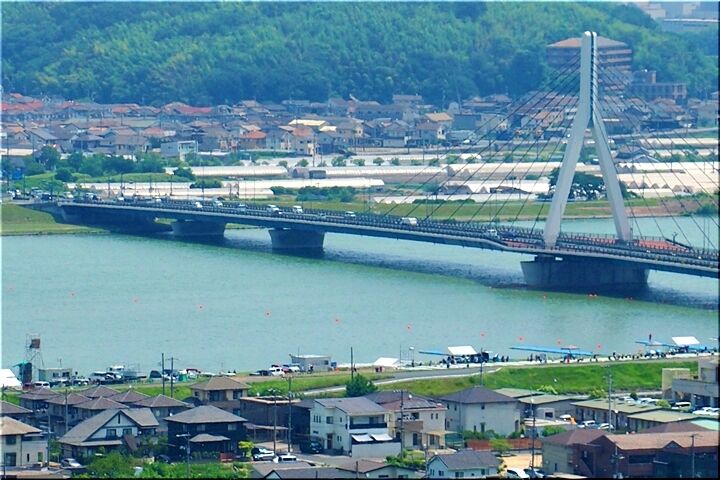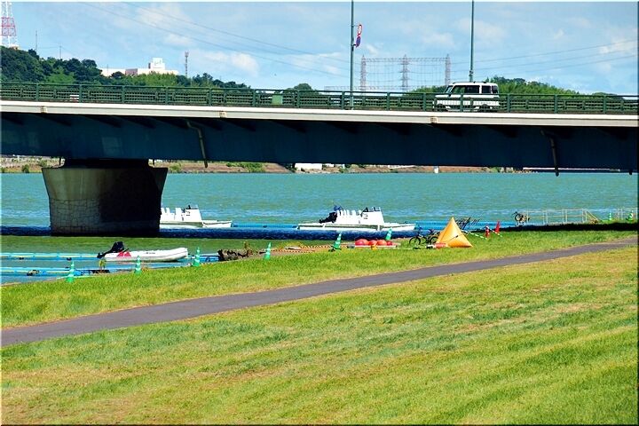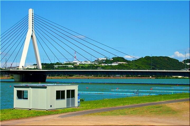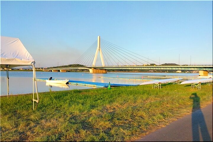 芦田川大橋から少し上流辺りでは、8/1(土)〜8/3(月)間のローイング競技実施に向け着々と準備が進行していますようであります。