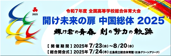 7/23(水)〜8/20(水)は、「令和7年度全国高等学校総合体育大会(中国総体2025)」の開催で、福山市では、ローイング∞水泳(飛込)∞テニス∞少林寺拳法≠フ観戦が可能です。