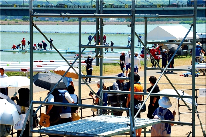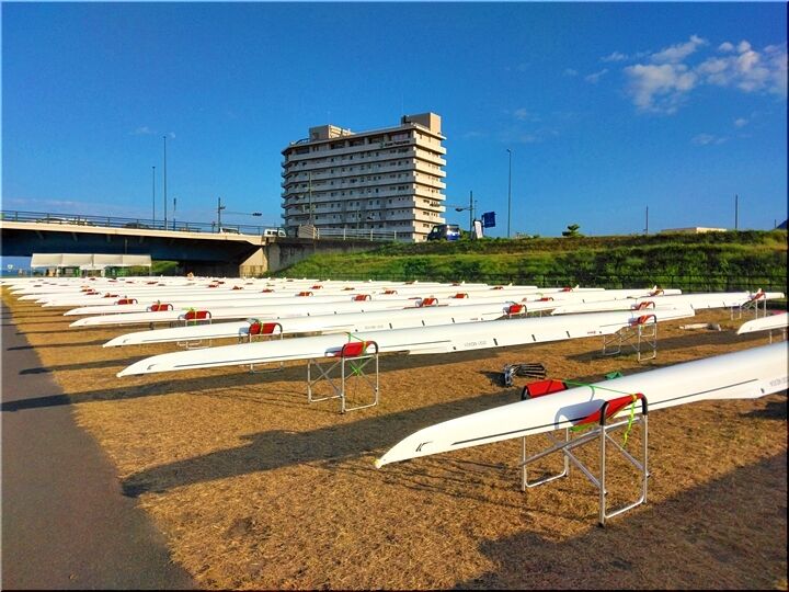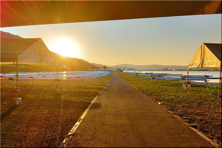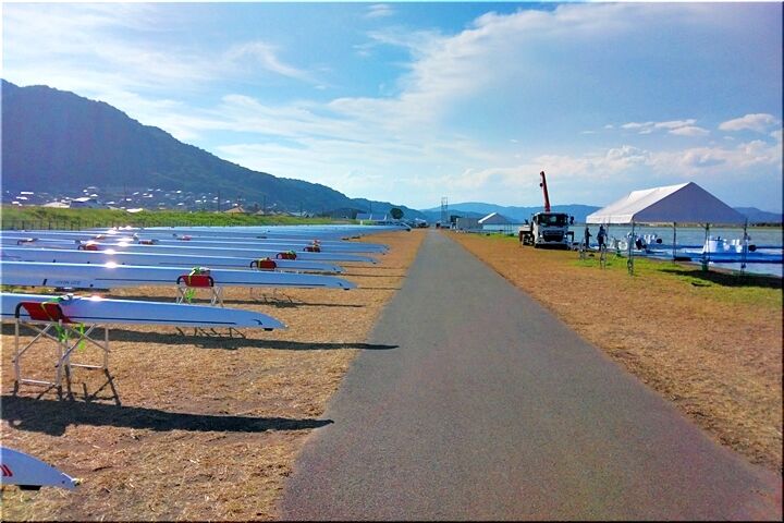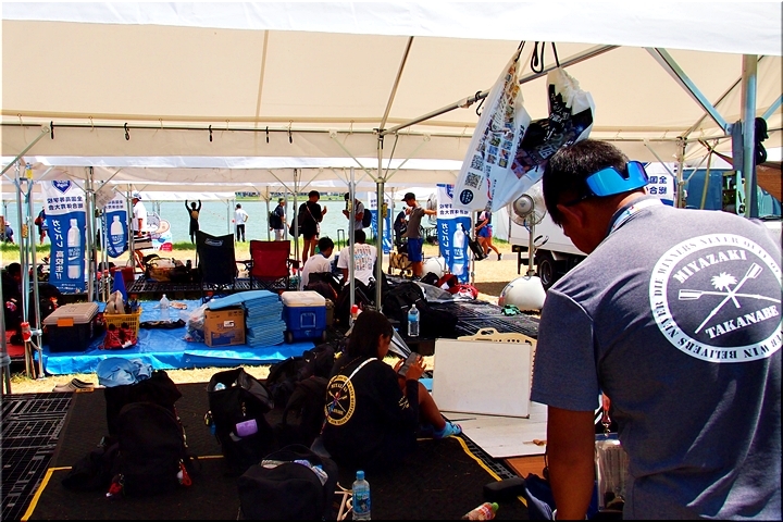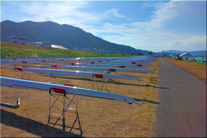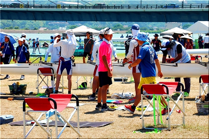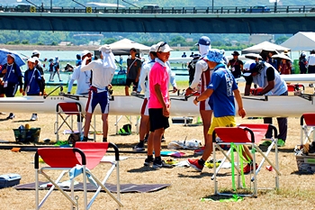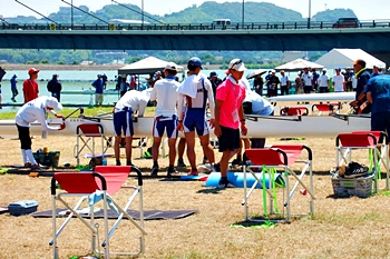 本日は公式練習(2日目)と開会式・代表者会議が行われました。気温上昇とともに風も少し強まる中での水上練習となりました。選手たちは日傘やアイシングスポットを利用しながらリギングをしていました。
