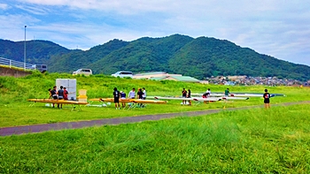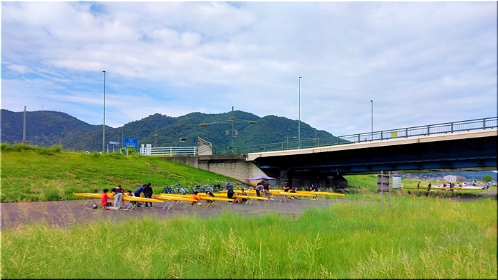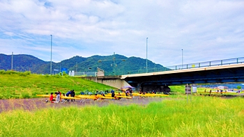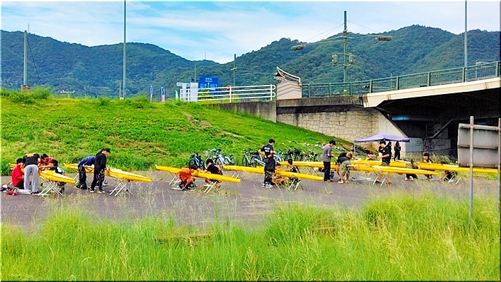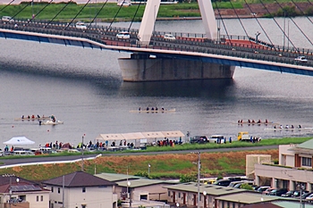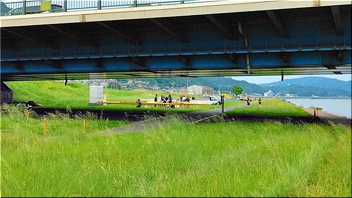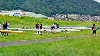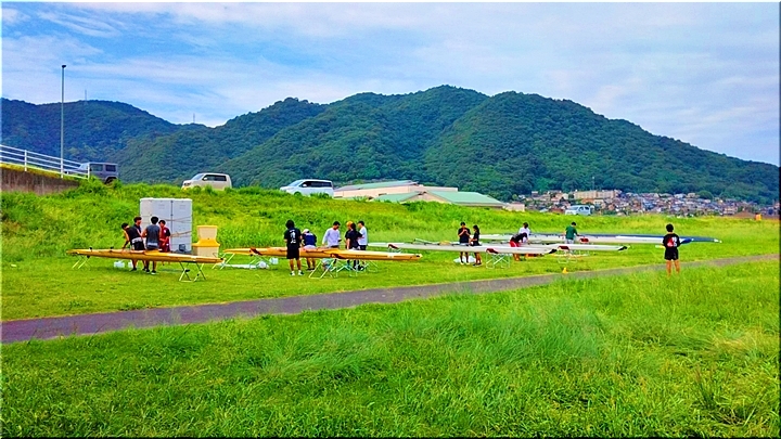 芦田川大橋近くの河川敷では、学生の皆様が艇の手入れ中。