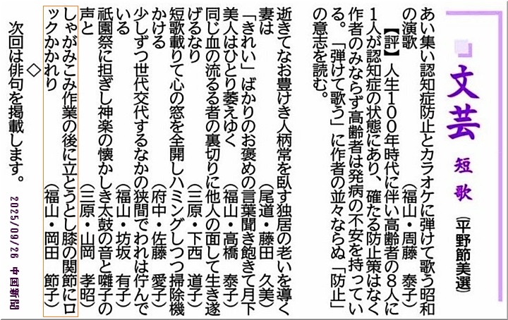 昨日の中国新聞朝刊紙上の文芸(短歌)コーナーに、また、従姉の投稿作品が…