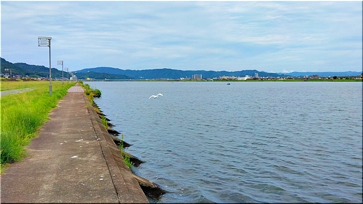 この方々を横目に護岸を小水呑橋へと向かっておりますと、前方にシラサギ君が一羽。次第に近付きますと、飛び立ちまして100mばかり前方の護岸にと着地です。