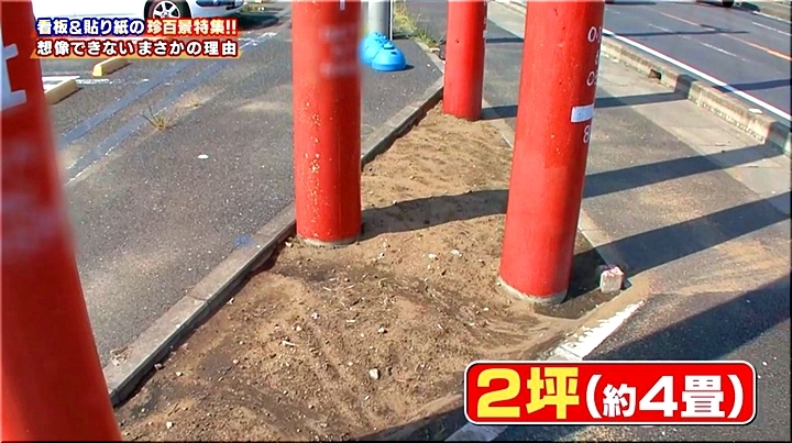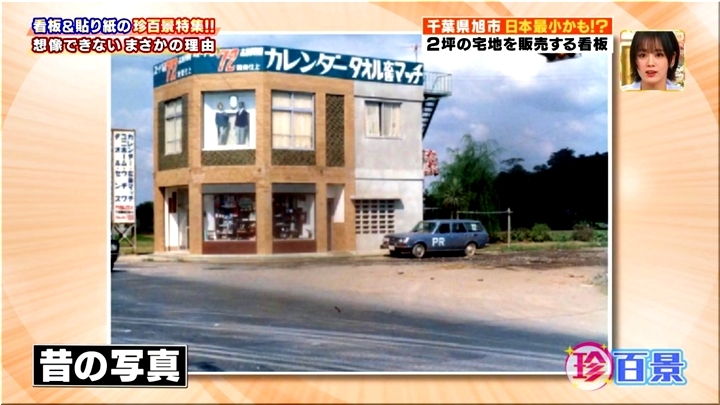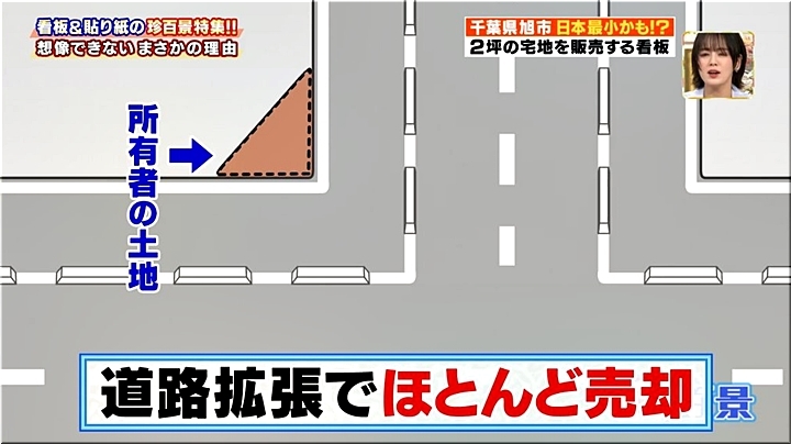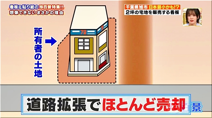 元は40坪ほどの土地だったが、道路拡張の影響でタタミ4畳程の土地だけが残ったため、柱を立てて広告塔としてアピールしていたそう。