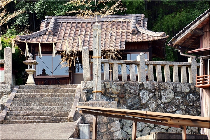 由来記によれば、安元元年(1175)小松内大臣重盛公、厳島神社参詣の途中、この山に登り当社と熊野神社を祀ったとも伝えられています。(水呑町史より)