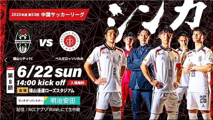6/22(日)には、P.M.2:00から竹ヶ端運動公園内の「福山通運ローズスタジアム」で福山シティFC×ベルガロッソいわみ$が開催されますから、何にも予定がありませんと観戦・応援に出掛けてみたいですネ。