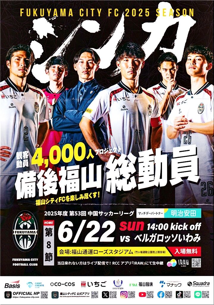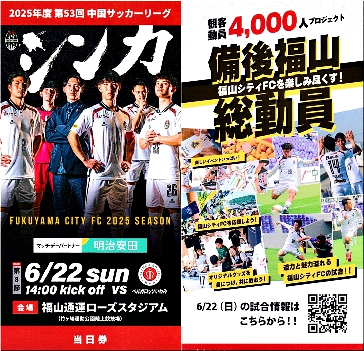 6/22(日)の福山シテイFC×ベルガロッソいわみ$…観客動員4千人クリアを祈ってます(^.-)☆